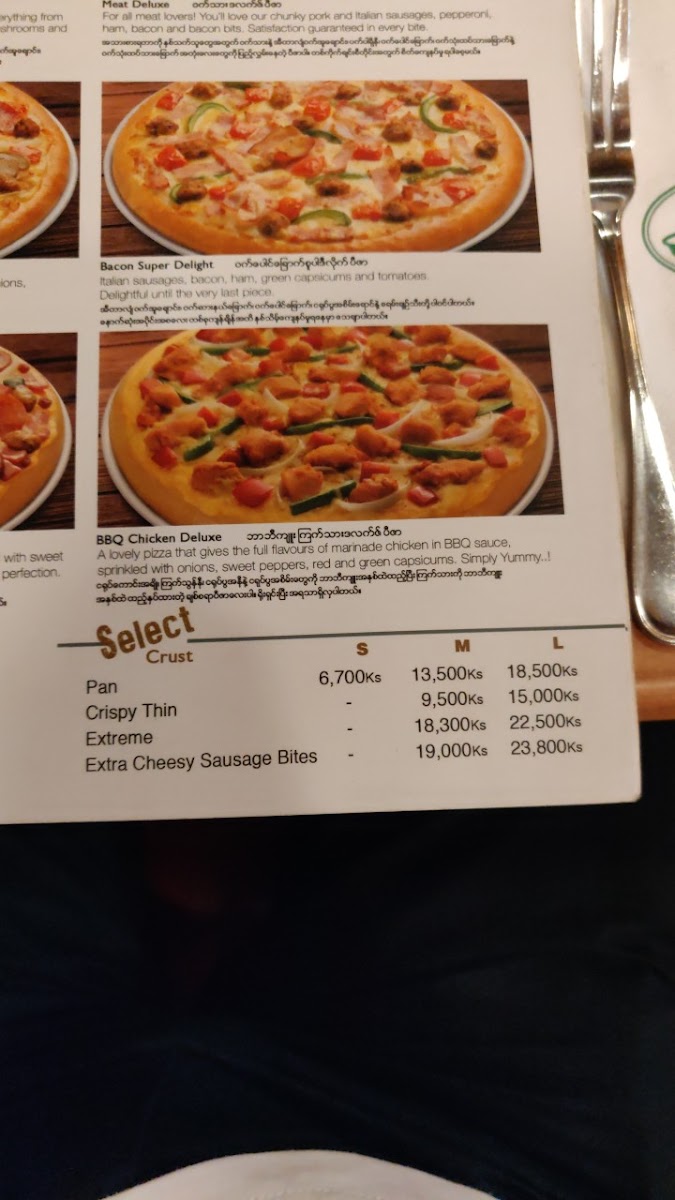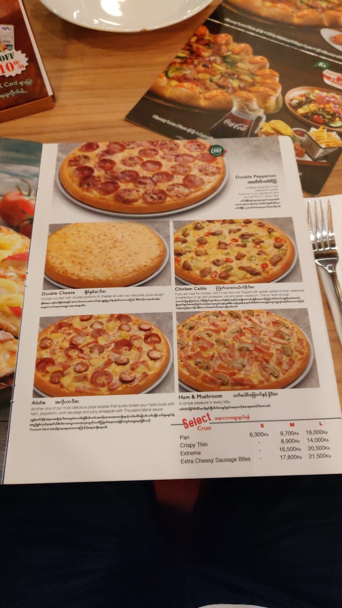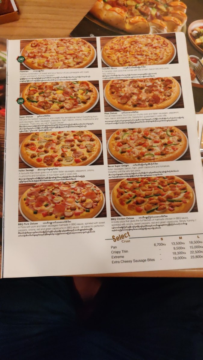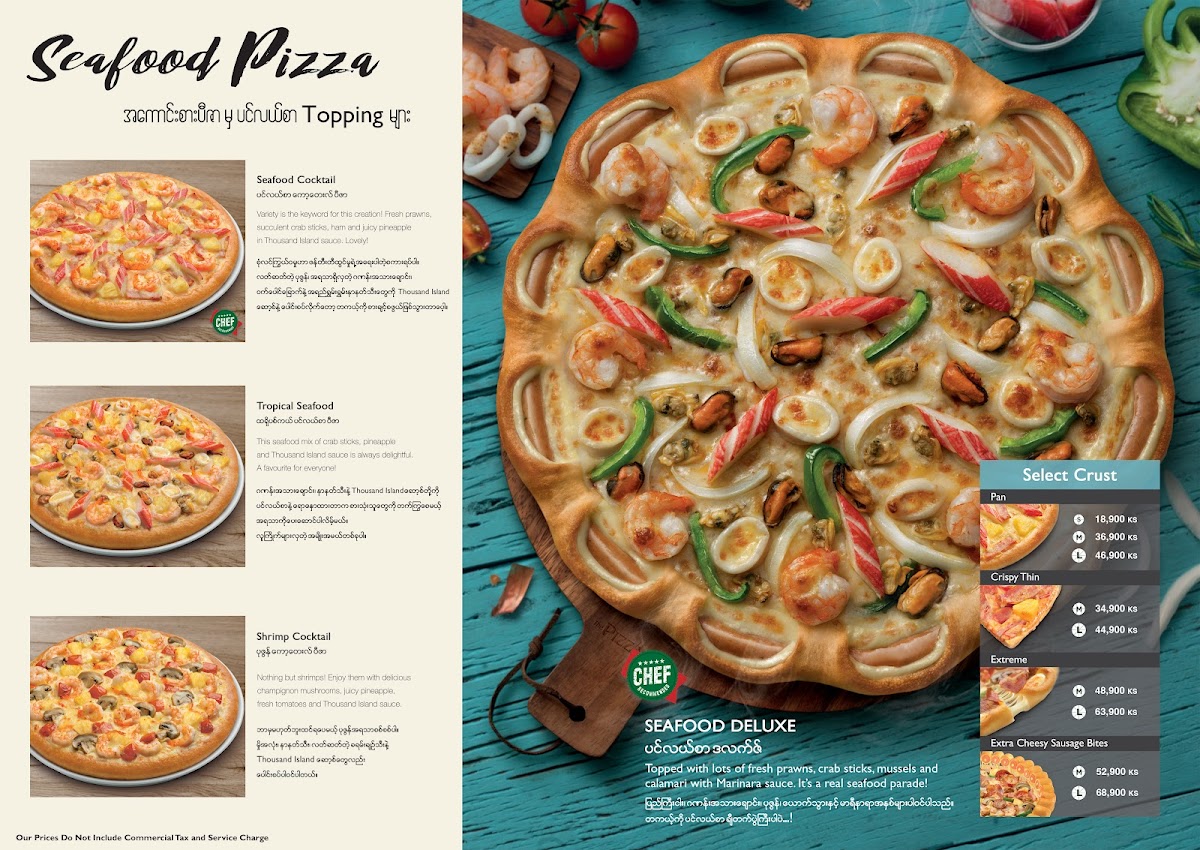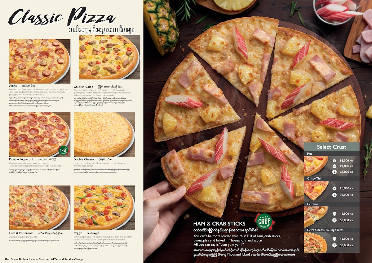 The menu also includes some creative variations with their Jumbo Pizza Puff options like Sausage and Crab Sticks and Hawaiian, while the Burger Pizza line offers a fun twist on the classic, featuring pizzas like the Classic Large Burger Pizza and Seafood Medium Burger Pizza.